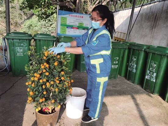 在荔湾区,有关部门向辖区内孤寡老人、残疾人等特殊群体,提供免费上门回收废弃年花年桔的便利服务;在越秀、海珠、黄埔等区,城管部门进一步用好“绣花功”,把废弃年花年桔“三分离”扩展到“四分离”,鼓励市民群众将年桔加盐封存淹泡成咸柑桔,或制作成环保酵素;天河、白云、番禺、花都等区为镇街配置小型绿化碎枝机,将废弃年花年桔就近碎化,在农田里进行堆肥处理;南沙区各镇(街)安排环卫工人对废弃年花年桔进行二次分拣,精准分类;从化区联系附近的花卉场对完好的花盆、年桔等进行回收利用;增城区加强检查督导,严格运输管理,防止出现混收混运等不规范作业行为。
