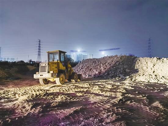 闲置场地内正有工作人员在装卸、处理建筑垃圾