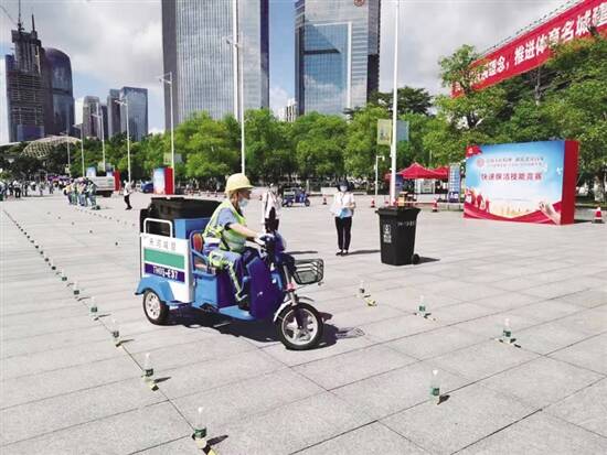 据介绍,整个职业技能竞赛分为六个项目:一是知识竞赛,内容包括垃圾分类知识竞赛、实操竞赛,以及环卫精细化保洁知识竞赛;二是小型扫路机清扫技能竞赛,参赛选手要快速完成路面清扫保洁任务;三是清扫保洁及快速保洁车作业技能竞赛,参加选手要完成道路日常清扫保洁任务后,驾驶快速保洁车迅速清理路面的各种小垃圾;四是卫生间保洁技能竞赛,参赛选手在指定的公厕进行保洁,保洁项目包括一个尿兜的清洁、一个蹲厕坑位的清洁;五是口香糖污迹清洁技能比赛,要求在不破坏地面的情况下,以最短时间清理地面积存的口香糖污渍(竞赛内容:1平方米内分布在地面的香口胶污渍10处,要求在不破坏地面的情况下,以最短时间清理地面积尘的口香糖污渍);六是油污清洁技能比赛,要求在不破坏地面的情况下,在规定时间内完成油污的清洁(竞赛内容:2平方米内分布在地面的油污渍2处,要求在不破坏地面的情况下,在5分钟内完成油污的清洁)。比赛项目都和2021年天河区环卫工作的重点内容相匹配,各个竞赛项目都结合了环卫的日常工作,展现了天河区加强城市精细化、机械化、品质化管理,有助于进一步提升环卫队伍业务素质和适应工作的能力。