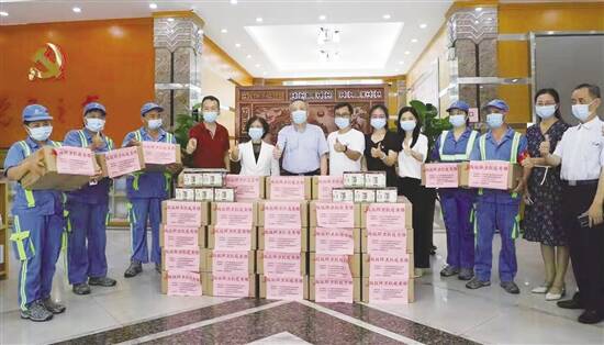 广东建设报讯 记者誉建业、唐培峰,通讯员成广聚报道: 为向防疫一线的环卫工人表达关爱,在广州市城市管理和综合执法局指导下,广东省岭南教育慈善基金会、广东省环境卫生协会联合发起“致敬城市防疫勇士”活动。6月16日,3000多个防护面罩、2000多个防护口罩、3600瓶冰杨梅汁、2400盒面条等首批爱心物资的捐赠仪式正式举行。