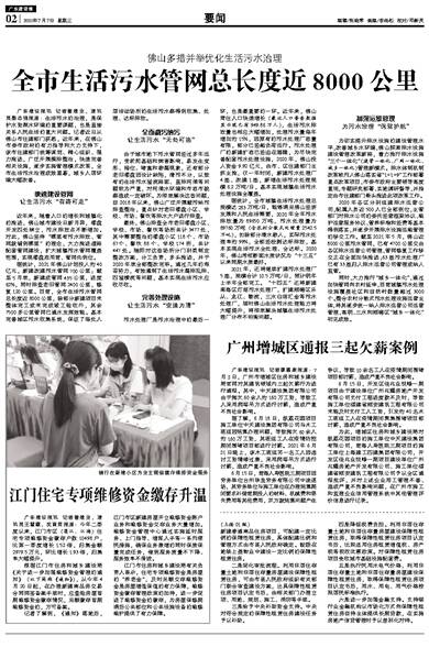 近年来,随着人口的增长和城镇化的推进,佛山城市建设日新月异,楼盘开发四处林立,污水排放点不断增加。对此,佛山坚持“哪里有污水排放、管网就铺到哪里”的理念,大力推进道路配套管网建设,扩大城镇污水管网覆盖范围,实现楼盘启用前、管网先到位。