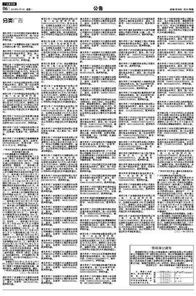 遗失声明 广东省新天元交通资讯有限公司佛山分公司遗失公章及营业执照正、副本,注册号:4406001008923,现声明作废。