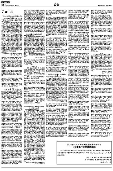 2021年-2026年惠州交投巴士有限公司公交车体广告代理招标已具备招标条件,公告内容详见“惠州市公共资源交易中心”网站(http://zyjy.huizhou.gov.cn/)发布的招标公告。