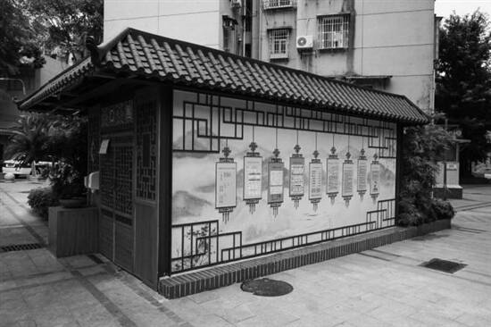 素社街兰蕙园垃圾分类投放点以传统岭南特色为设计元素,灰瓦飞檐、雕栏画栋,整体造型古朴大气,为老旧小区增添了一抹亮丽的色彩。