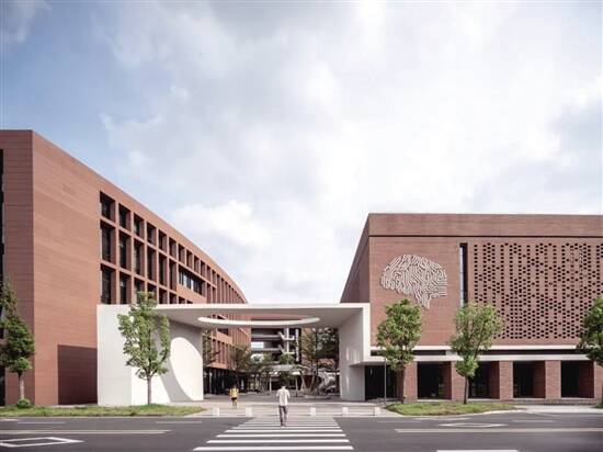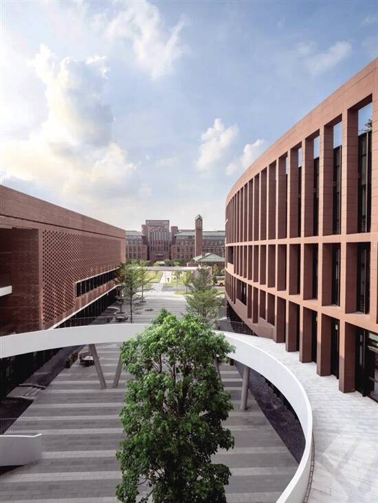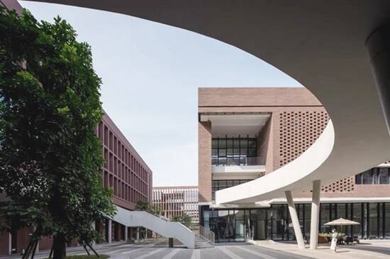 【岭南意蕴 寓旧于新】 立面设计注重与华工老校区风格的传承,以竖向红色陶砖立柱为主要造型元素,构件阵列形成韵律,整体简洁大方。东立面及北立面设置参数化镂空砖墙,运用现代幕墙体系结合传统材料,营造丰富光影效果。建筑着力体现岭南地域特征,以架空柱廊、庭院、错落平台、空中花园、屋顶遮阳、立面遮阳等手段回应岭南地区独特的气候条件,形成多样化的立体庭院空间。