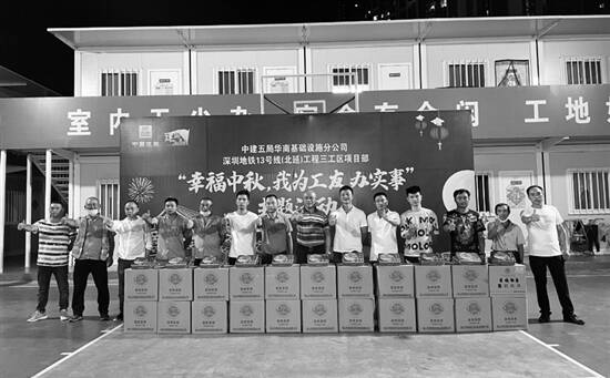 广东建设报讯 记者誉建业、通讯员陈亭羽报道:中秋佳节,本是合家团聚、乘秋出游的好日子。但随着全国多地疫情蔓延,防疫警报再次响起,深圳地铁13号线北延项目200余名农民工友选择留守工地,奋战在现场一线。为了让农民工友在中秋之际感受到异乡的温暖,9月19日,中建五局华南公司基础设施分公司深圳地铁13号线北延项目现场举办了一场团圆盛会。