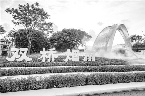 今年,广场上立起一座“双桥烟雨·双兰汇心”景观雕塑,以两座曲面叶形构架交错相握,地面兰花型花池、草阶、花境融为一体,让双桥的烟雨从老广依稀的记忆中化为现实。随着“双桥烟雨”成为网红打卡点,以滨水湿地为理念的碧道景观将成为又一个新的亮点,国际城市花园岛进一步显露雏形。