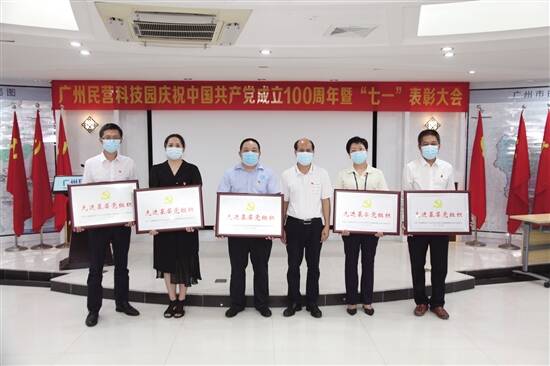 广州民营科技园管委会党组副书记、主任高荣志(右三)颁发“先进基层党组织”牌匾