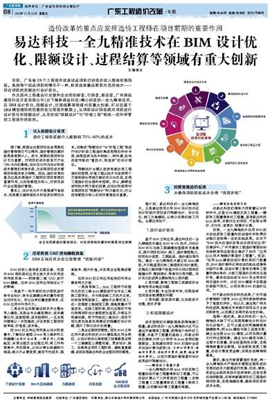 作为国内工程建设行业软件企业的创新者、引领者、驱动者,广州易达建信科技开发有限公司(以下简称易达科技)精心研发的一全九精准技术,在BIM设计优化、限额设计、过程结算等领域均有重大创新,可以在基于BIM模型提供的完整的全过程造价数据上,从项目设计阶段就对项目进行设计优化和限额设计,从而实现“限额设计”与“价值工程”相统一的科学管控工程造价的目的。