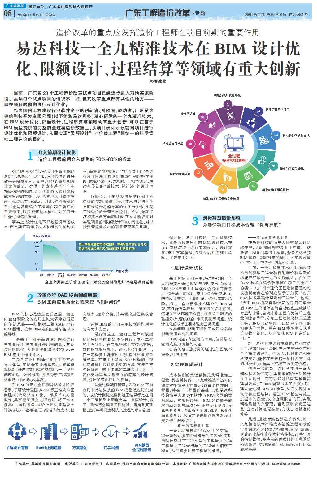 易达科技一全九精准技术在BIM 设计优化、限额设计、过程结算等领域有重大创新