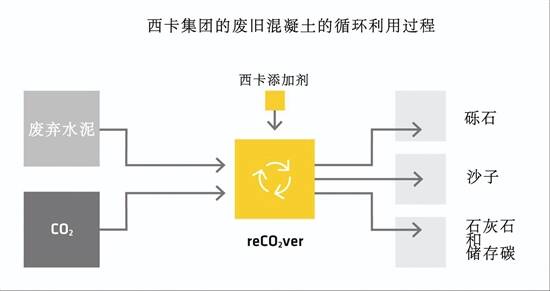 通过获得专利的reCO_2ver工艺,西卡集团(一家在全球各地生产及经营建筑用化学材料产品的跨国公司)开发了一种高效的工艺来分离和再利用拆除的混凝土部件,并能够提高再生骨料的质量。该过程包括对混凝土拆除废物进行化学机械处理的协同作用。该技术能让水泥的表面碳化(即二氧化碳溶解在水或水溶液中),经过摩擦能够将其软化并去除。通过这个过程,水泥获得了新的暴露表面,这些表面能够进一步碳化,直到获得无水泥骨料。