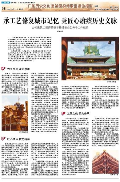 此前,从北京来的古建专家组到佛山研讨时,给予了黄德节承建的仁寿寺改造提升工程极高的评价:“在国内同类寺院中,仁寿寺大雄宝殿使用的材料最好、单体最大、工艺最精。”