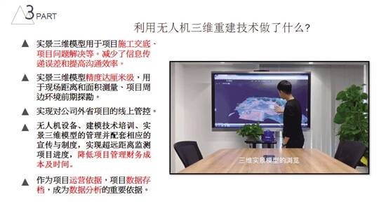 陈祺荣表示,这项技术实现了项目三维实景展示、远程项目进度管控、工程回溯以及远程工程测量,以可视化、实景化的方式保证施工进度和工程质量,降低项目管理财务成本及时间。“该技术从2018年运行到现在,我们估算为公司省了上千万成本。”据了解,该技术已为集团提供企业级的无人机信息化管理平台,已在50个工程项目开展实际应用,建模次数共566次,采集影像数据达30万张以上。