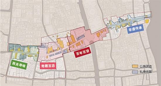 该项目规划结构为“两带+双芯+五轴”,以线串点,重塑繁华城厢市井。依托美食老字号、现状闲置商业空间引入沉浸体验式业态,融入科技、艺术及商业元素,重塑五大活力热点。功能活化主要依靠公房改造,结合公房质量和产权情况,进行整栋改造、首层打通、立面整饬,以承载业态更新。同时,该项目还将构建全景叙事脉络,整治街巷环境,有机串联街巷内的历史要素,打造“居者乐,游者趣”,展示上下九历史文化和街区肌理的特色社区。