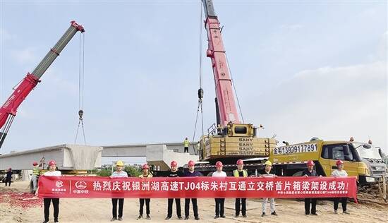 朱村互通立交预制箱梁的成功架设,全面揭开了银州湖高速项目箱梁架设的序幕,掀起一鼓作气、大干实干热潮,增强了项目员工凝聚力,为加快银洲湖高速项目后续架梁施工迈出了坚实的一步。
