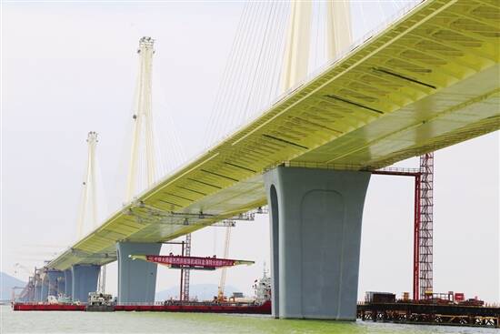 广东建设报讯 记者唐培峰,通讯员谢珍、孟庆虎报道:9月5日10时18分,粤港澳大湾区重点工程——珠机城际金海特大桥主跨钢梁成功合龙。金海大桥是世界首座公铁同层多塔斜拉桥,同时也凭借49.6米的桥面宽度,创造了目前世界上最宽公铁两用多塔斜拉桥的世界纪录。