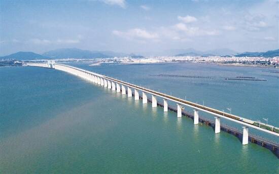 中国铁路南昌局集团有限公司相关负责人介绍,由于海上水文环境复杂,风险系数高,新建福厦铁路全线铺轨有三处难度极大的施工地点,分别为湄洲湾、泉州湾、安海湾三座跨海大桥。为此,施工单位采用国内先进的本邻两线铺轨作业设备,左右两线长钢轨同时铺设,比传统铺轨机组提高60%的作业效率,日进度可铺设长轨约6公里,为新建福厦铁路按期开通打下坚实基础。