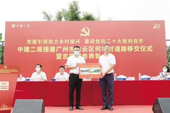 广东建设报讯 9月22日,中建二局(广东)建设有限公司粤海云港城项目援建广州市白云区何㘵村道路移交仪式暨志愿服务表彰大会在何㘵村举行。