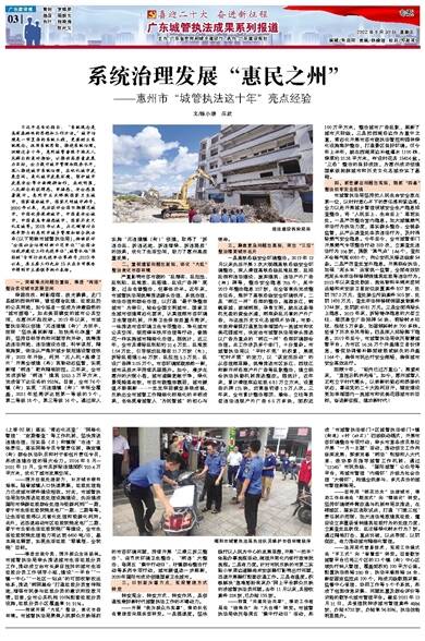 习近平总书记指出:“系统观念是具有基础性的思想和工作方法。”城市治理是一项复杂的系统工程,更要树立系统观念、运用系统思维、推进系统治理。回顾过去十年,惠州城管着眼于满足人民群众的美好期盼,以推动高质量发展为目标,全力提升城市管理和服务水平,深入推进城市系统治理,在优化城市发展空间、美化城市发展环境、维护城市发展安全等方面精耕细作,成效明显,人民群众的获得感、幸福感、安全感显著提升。惠州市五次蝉联国家卫生城市、国家园林城市、国家文明城市称号;2000年以来,先后获评全国双拥模范城市、中国优秀旅游城市、中国最安全城市、中国最具幸福感城市、国家历史文化名城等。2018年以来,为之倾情付出艰辛努力的惠州市城乡管理和综合执法局(以下简称市城管执法局),相继获评“全国社会治理创新示范单位”“全国法治政府建设工作先进单位”、城管队伍“强转树”专项行动先进单位等称号;2019年以来,其主要工作先后15次在专项报告中得到市主要领导批示表扬。