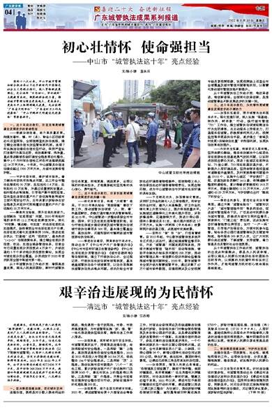 ——深化体制改革,构建“大城管”格局。于2012年率先结合“简政强镇”事权下放工作,推动城管执法领域“人、财、事”向基层赋权,积极打造市镇齐抓共管新格局。至2019年,中山城管进一步整合承接全市市政、园林、环卫及垃圾处理等管理职能,至今行使住房城乡建设领域及城市管理执法领域行政执法事项共500项,基本建立覆盖全面、高效运转、无缝衔接的市镇两级城市管理综合执法体制。