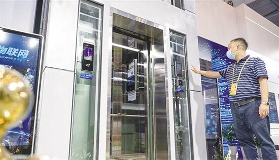 2022年智博会重庆馆内,工作人员现场展示“智慧电梯”功能。图源:新华网