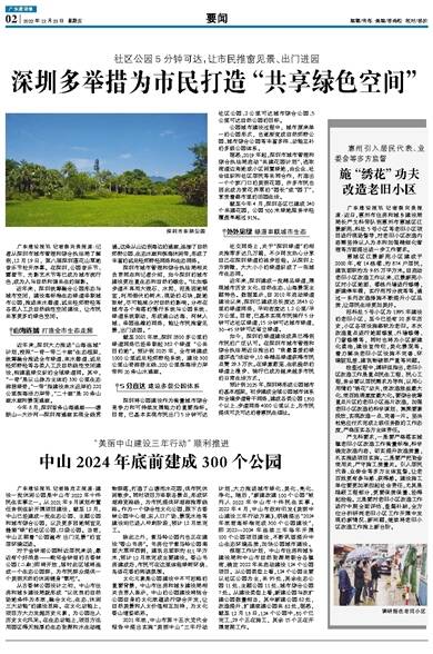 2021年底,中山市第十五次党代会报告中提出实施“美丽中山”三年行动计划,大力推进城市绿化、美化、亮化、净化。随后,“新建改建100个公园”被列入2022年中山市十件民生实事。2022年4月,中山市政府印发《美丽中山建设三年行动方案》,明确提出“2024年底前高标准完成300个公园建设”,即2022—2024年连续三年每年开展100个公园项目建设,不断巩固提升中山生态环境品质,加快公园城市建设。