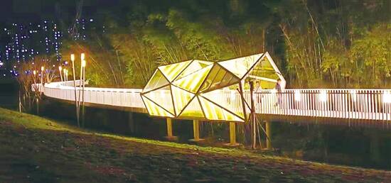 在选材、构造等方面,通过对细节的推敲,使栈道具有丰富的观赏性和趣味性。廊架采用玻璃和穿孔板结合以丰富其展示效果,并采用灯光设计勾勒出廊架外观;景观灯柱以不同角度倾斜,使栈道立面效果错落有致,远观像一首动人乐章的音符起伏跳动。