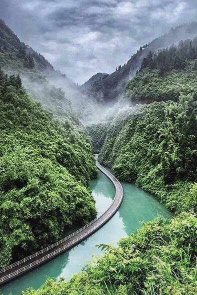 恩施狮子关水上栈道位于湖北省恩施市宣恩县城珠山镇,顺着蜿蜒的河道建设而成,名为“廊桥遗梦”。木栈道下有大量浮筒,驾车经过时桥面浮动,波澜微漾,如舟行水中激起片片涟漪。远眺则两岸层峦叠翠,漂浮栈道如一袭玉带,横亘在翡翠般的碧波之上。