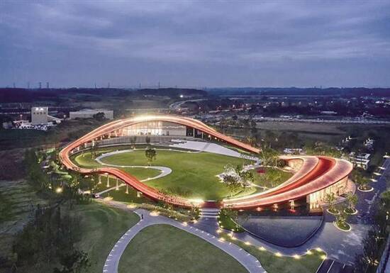 智慧之环有机的流线形态,呼应了成都平原四周环绕的山脉。极具“川味儿”的红色跑道随着曲面高低起伏,中间环抱着绿意盎然的绿地,从地面一直蔓延至建筑屋顶,人们通过高高的平台俯瞰城市,与城市、人文、自然对话。