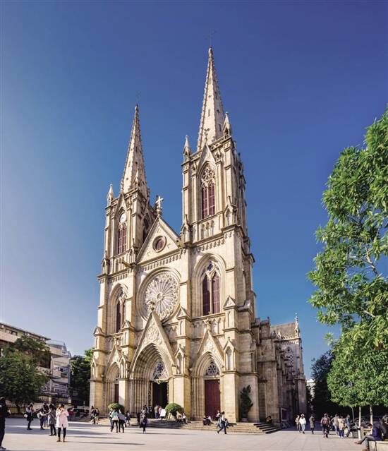 位于百年老街一德路的石室圣心大教堂,是广东融合中外文化的标志性建筑之一。石室圣心大教堂由法国设计师设计、中国工匠建造,用数以十万计的花岗岩搭建而成。它不仅是全国乃至东南亚最宏伟的双塔哥特教堂,也是全球四座全石结构哥特教堂之一,拥有“远东巴黎圣母院”的美誉。