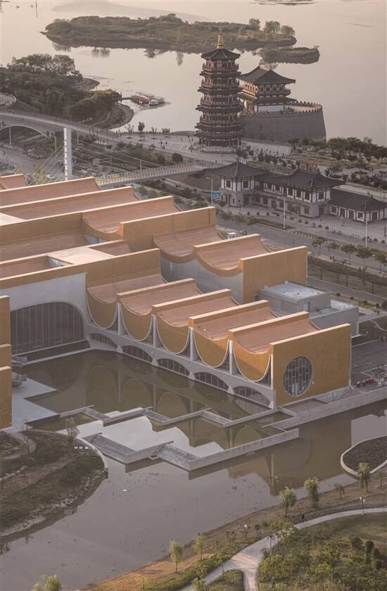隋唐大运河博物馆独特的曲面屋顶,是建筑师从隋唐建筑中提取的元素。博物馆内部仿佛一个城市客厅,四面通透,馆内大跨度混凝土拱仿佛将一座座桥“搬”到空间内,勾勒出独特的空间秩序,色彩斑斓的三彩装置则赋予了空间艺术氛围。