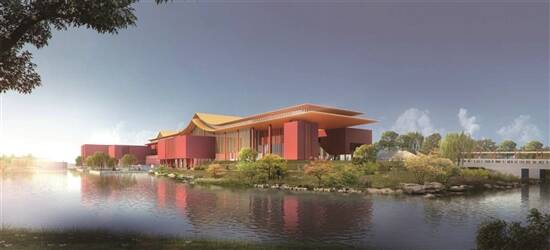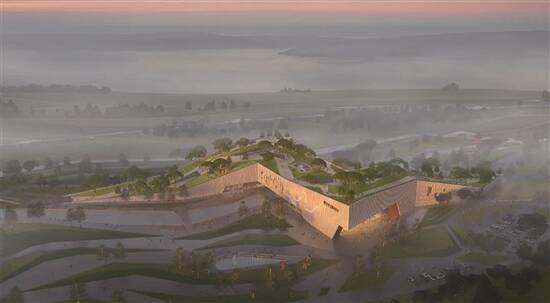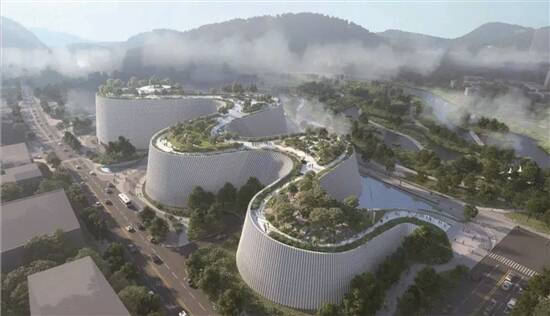 建筑外观是三星堆标志性的“古蜀之眼”的抽象形态,屋顶采用斜坡覆土形态,建筑融入场地,形成三个沿中轴排列的覆土堆体,寓意“堆列三星”,生成独特的形体韵律。三星堆博物馆新馆现已破土动工。