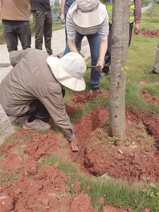 现场,“树医生”实地为树木“把脉问诊”,与传统中医的“望闻问切”类似,通过观察植物颜色长势、闻气味、询问养护单位等方式为树木进行健康检查。专家团队检查了紫荆、铁冬青、木棉等植物的健康状况,发现存在根系坏死、土壤板结、枯枝回芽等问题。专家在现场强调,后续的养护工作要进一步改善土壤条件,加强肥水管理,适度修剪,并按照“预防为主、综合防治”原则对树木进行病虫害防治。