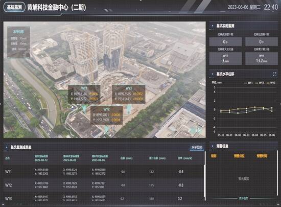 在智慧管理方面,项目建立数据指挥中心,涵盖进度、安全、质量、物资等模块,形成“一张图”管控系统。安装塔吊安全监测预警系统、施工电梯传感器及操作人员监控系统,并使用“检到位”智慧巡检系统。利用AI人工智能识别技术,实时监测现场人员的安全帽、反光背心等佩戴情况,及时纠正施工现场人员安全作业行为。基坑施工设置天幕系统,有效降低扬尘影响。采用5G+AI技术,实现非接触式基坑监测、实时监测数据全程记录,减少人工监测工作量,历史记录可追溯支持微信、短信报警,相较传统人工监测,管理人员可实时掌握基坑变形监测情况。建立高支模、悬挑型钢式脚手架等关键施工工艺三维可视化交底,以互动的方式开展交底活动。