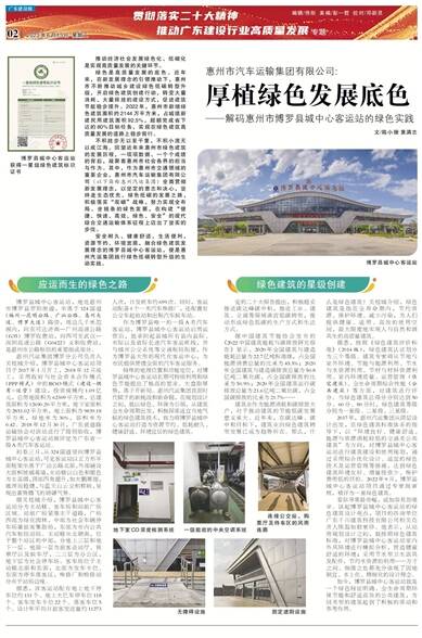 不积跬步无以至千里,不积小流无以成江海。回望近年来惠州市绿色建筑的发展历程,一项项数据、一个个成绩的背后,凝聚着惠州市社会各界的担当与作为。其中,作为惠州市交通领域的重要企业,惠州市汽车运输集团有限公司(以下简称惠州汽运集团)全面贯彻新发展理念,以坚定的意志和决心,坚持走生态优先、绿色低碳的发展之路,积极落实“双碳”战略,努力实现全布局、全链条的绿色发展,在构建“便捷、快速、高效、绿色、安全”的现代综合交通运输体系征程上迈出了坚实的步伐。