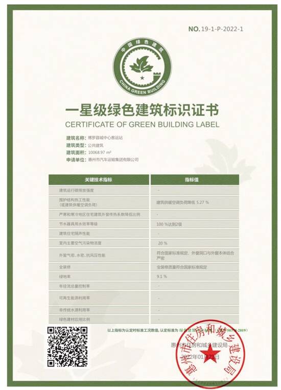 博罗县城中心客运站获得一星级绿色建筑标识证书