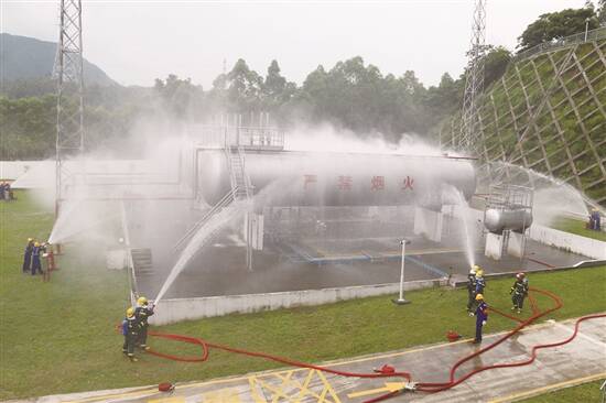 演练模拟了穗东燃气3号液化石油气储罐中部焊缝发生较大量泄漏,气站监控巡检人员离岗未注意到安全阀报警信号,导致大量泄漏蔓延到围堰。事故发生后,各应急处置单位有序开展信息报送、组织疏散警戒、高压注水、水雾稀释、应急堵漏等应急措施,特别是实战检验当泄漏危险性升级,政府主导下升级响应级别、部门联动响应及专业抢险队增援有关情况。