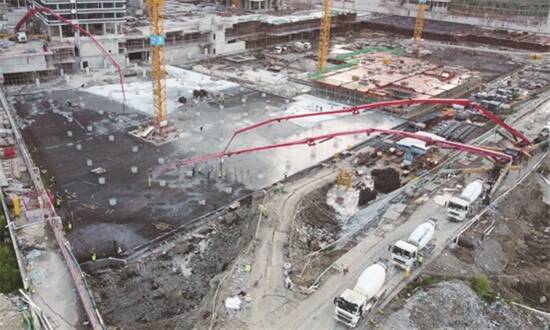 8月5日下午3点,G区大型底板浇筑准时开盘。此次浇筑区域总面积超过6000平方米,相当于6个标准游泳池大小,浇筑的大面积板最深处厚度达1.5米,一次性浇筑混凝土方量接近1万平方米。