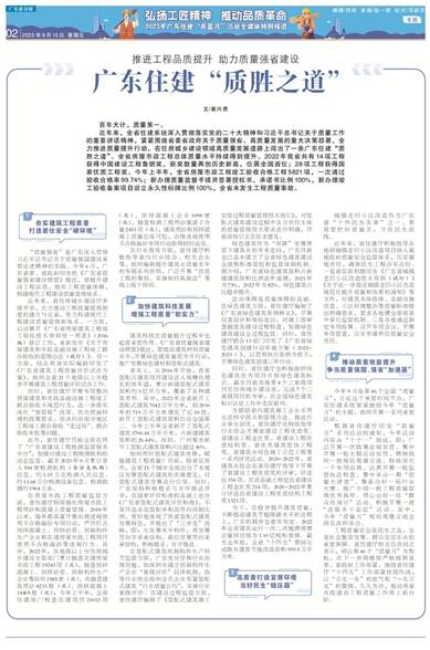 “质量强省”是广东深入贯彻习近平总书记关于质量强国建设重要论述精神的实践。今年6月,广东省委、省政府印发的《广东省质量强省建设纲要》提出,要提升建设工程品质,强化工程质量保障,构建现代工程建设质量管理体系。