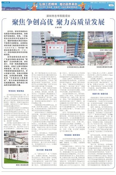 吉华医院项目是2023年广东省住房城乡建设系统“质量月”主会场观摩工程。深圳建工、中建一局高质量推进项目建设,在施工过程中积极采用新技术、新工艺、新方法,不断探索智能建造新方式,并以党建为引领,实施分区管理制度、总承包责任制等,积极争创“中国建设工程鲁班奖”,努力为推进粤港澳大湾区高质量发展、提升建设工程品质贡献智慧和力量。