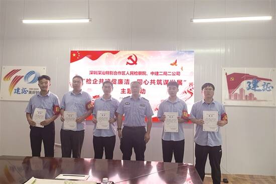 广东建设报讯 记者唐培峰、通讯员谢浴楠报道:近日,中建二局二公司与深汕特别合作区人民检察院在深汕高新产业园项目部开展“检企共建促廉洁,同心共筑谋发展”主题活动。深汕特别合作区人民检察院副检察长、检察委员会委员、检察员李海旭,深汕特别合作区鹅埠镇派出所副所长郭威,中建二局二公司纪委书记刘久明等参加活动。
