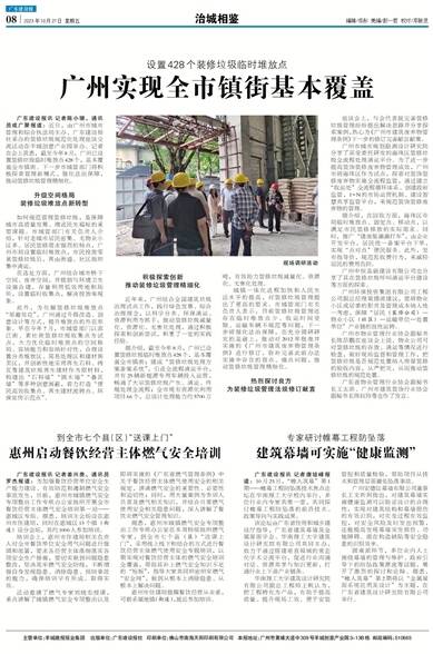 广东建设报讯 记者陈小珊、通讯员成广聚报道:近日,由广州市城市管理和综合执法局主办、广东建设报社承办的装修垃圾规范化处理座谈交流活动在羊城创意产业园举办。记者在会上获悉,截至今年8月,广州已设置装修垃圾临时堆放点428个,基本覆盖全市镇街。下一步市城管部门将积极探索管理新模式,强化法治保障,推动装修垃圾管理精细化。