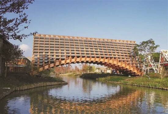 获奖项目中,广东共有5个项目入选。其中,位于江门的古劳水乡木桥,以“自然材-木料”进行“拱桥”建造,两端承台拱底高于常水位1.35米、拱弦高2.8米,保障了桥体底部与水面的游船通行净高需求,桥拱跨度依地勘、结构合理的两岸间隔定为25.2米,采取三根曲木大梁作为主结构件、以2.7米的轴线间隔进行平行排布,在合理位置分隔成三段开“榫卯”加钢构螺栓连接,通过这三段小曲梁在现场施工拼合,组成完整的大拱梁。