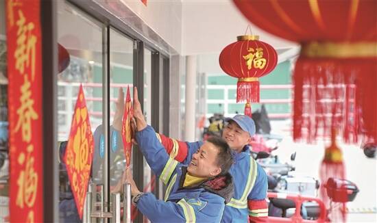 环卫工人贴对联、挂灯笼(白云区城管局供图)