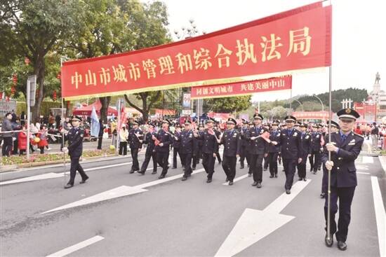 伴随着《我们与爱同行》的旋律,中山市城管执法局40名干部职工组成的巡游方阵精神抖擞、英气勃发地走在兴中道上。他们以“同创文明城市,共建美丽中山”为口号,用心用情守护城市,为市民打造美好生活家园。