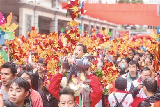 娃娃们骑在大人肩头、成千上万风车随风转动、人们提着生菜行过通济桥,桥上桥下灯火璀璨……2月24日,佛山“行通济”大型民俗文化活动吸引了众多游客前来体验。行通济,冇闭翳!(粤语,意为“走过通济桥就没有烦恼”)大家在元宵佳节祈求新的一年顺顺利利。
