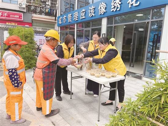 凤岗城管队员和志愿者向环卫工人送汤圆