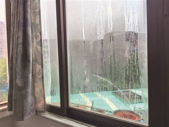 广东“回南天”期间,建筑玻璃窗上挂满了水珠。刘丽莎 摄