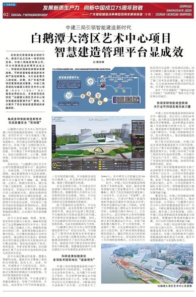 白鹅潭大湾区艺术中心项目是中建三局在智能建造领域的一次重要实践。该项目作为一项大型建筑工程,涉及多个专业领域的交叉施工,管理难度极大,项目通过自研智慧建造管理平台,实现了施工过程的数字化、智能化管理,有效提升了施工效率和质量。平台集成了多种智能建造新技术,包括大数据分析、云计算、物联网等,为项目的顺利进行提供了有力保障。