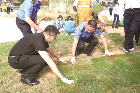 在活动现场,领导干部、学生、志愿者、环卫工人一起,分组对沙田镇中心小学周边公共区域进行清扫,洒水车、扫地机齐上阵,清理藏在边角的垃圾,还对校园周边的桥下空间进行了复绿。